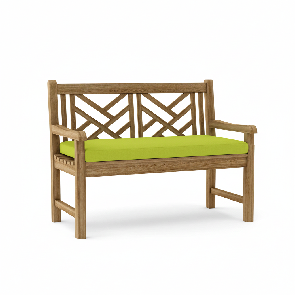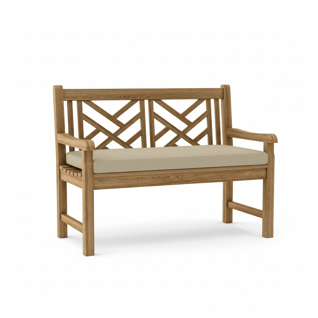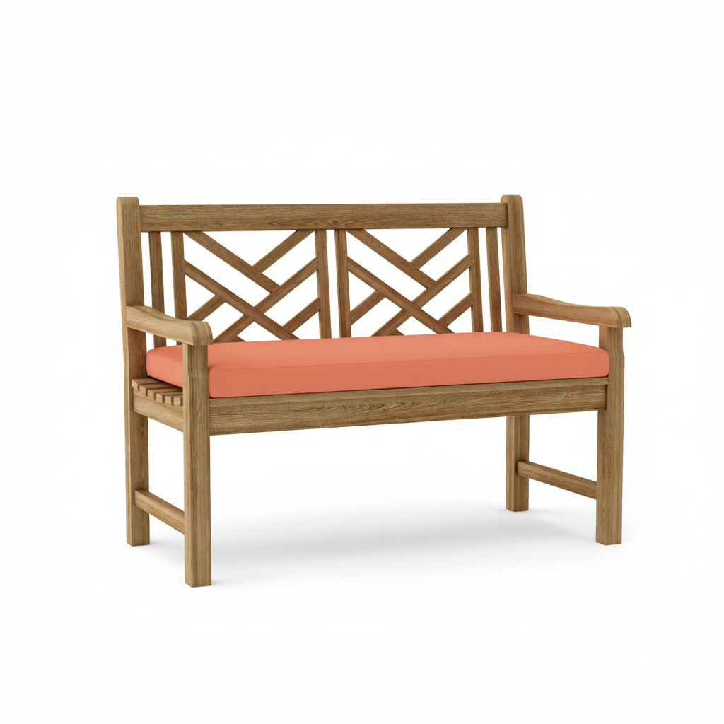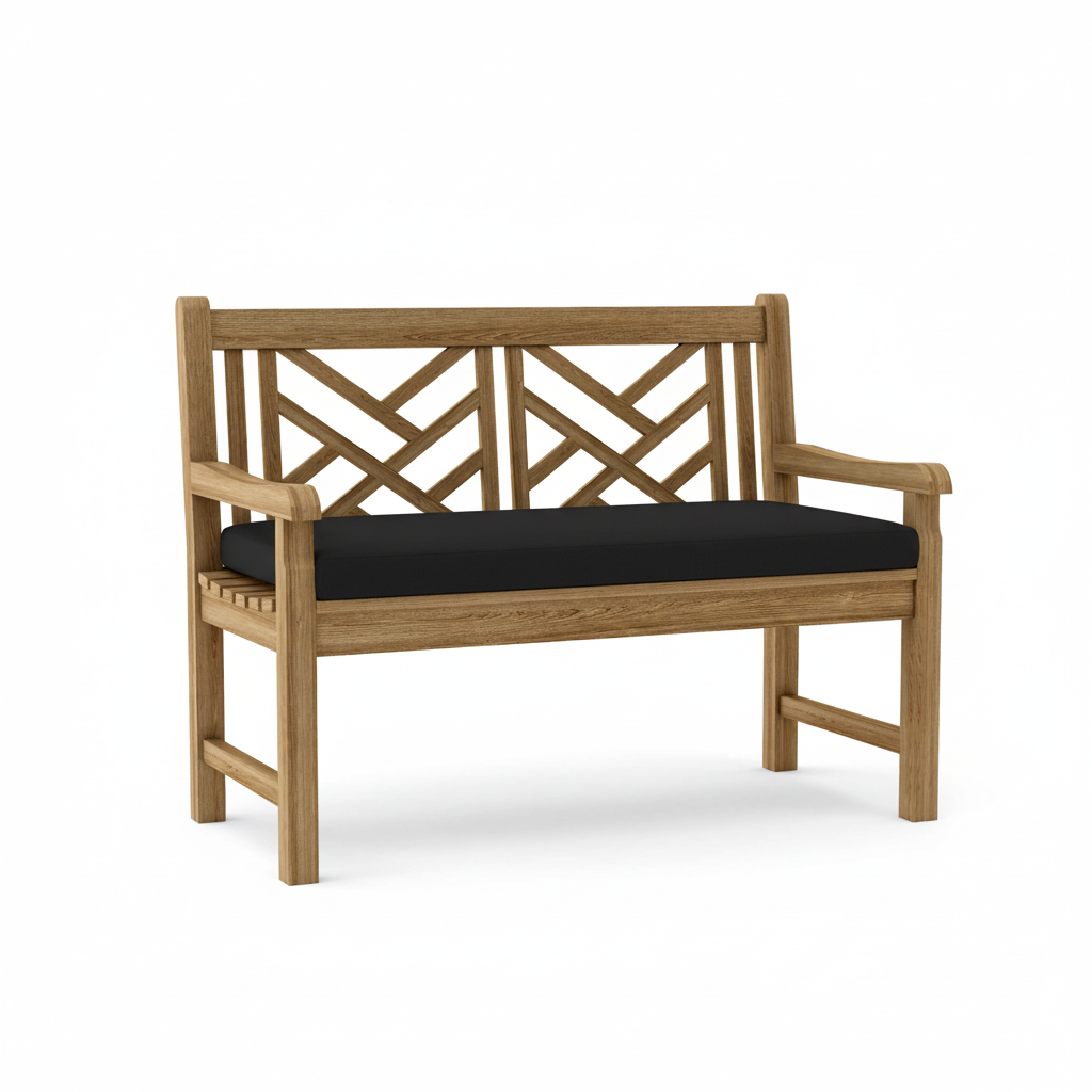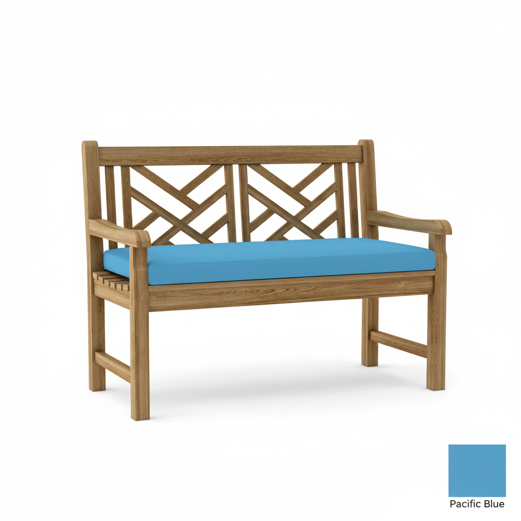 This Vilano 2-seater crisscross back style-bench is an expertly crafted piece of artwork that will never go out of style, but seamlessly blends with any setting. Made from the finest solid teak, which is strong and durable, it is sanded smooth without any finish in it’s natural form. This is a beautiful and functional piece of furniture for your patio or terrace. Place a single bench under a tree, or use a group of benches and chairs for a complete outdoor collection. Over time, the wood will weather to a beautiful silver gray patina or occasionally scrub down with soap and water to keep in pristine condition. Add Sunbrella All-Weather water repellent cushion for even more comfort.