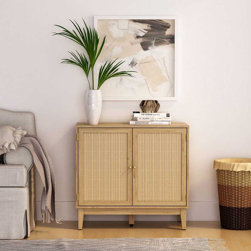 The Bodrum 33” Accent Cabinet featuring synthetic rattan doors is the perfect complement for the living room or bedroom sure to match any décor in your home. Place on top your portraits, vases, objects and more, with even more storage space inside its two synthetic rattan doors. Featuring gold plated door handles that elegantly accents the color of the sideboard, this sideboard also features non marking foot caps to protect flooring.