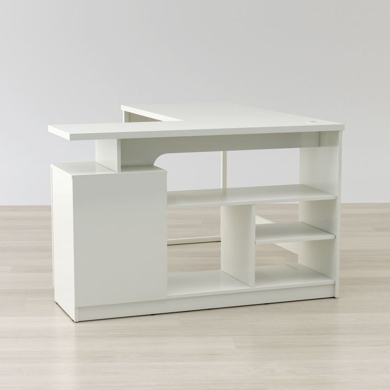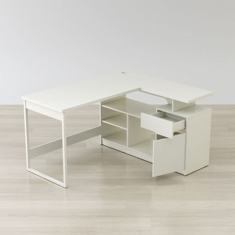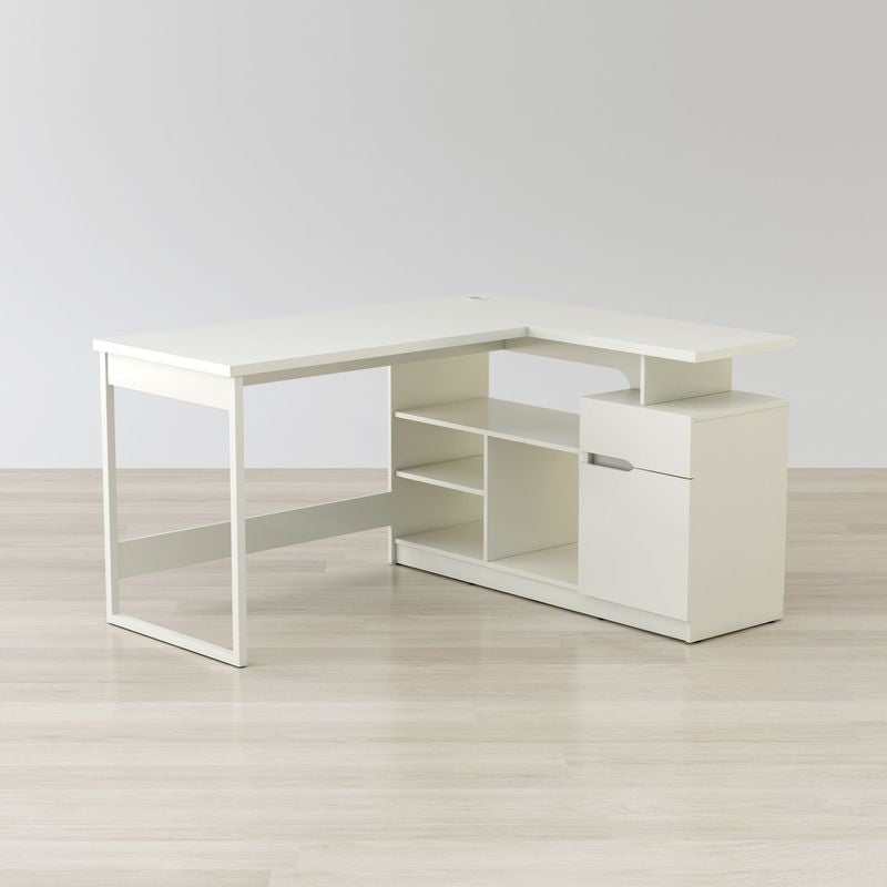 A modern contemporary corner desk sleek and stylish it’s also spacious and practical perfect for the home or office. Comfortably place office equipment as computers, phones, printers and scanners while seamlessly running any wires or cables through the grommet hole. With five storage spaces and a metal glide drawer easily organize your most important items for easy access. Made of metal legs and engineered wood it’s finished in a luminous gloss white PVC laminate, a water resistant material.