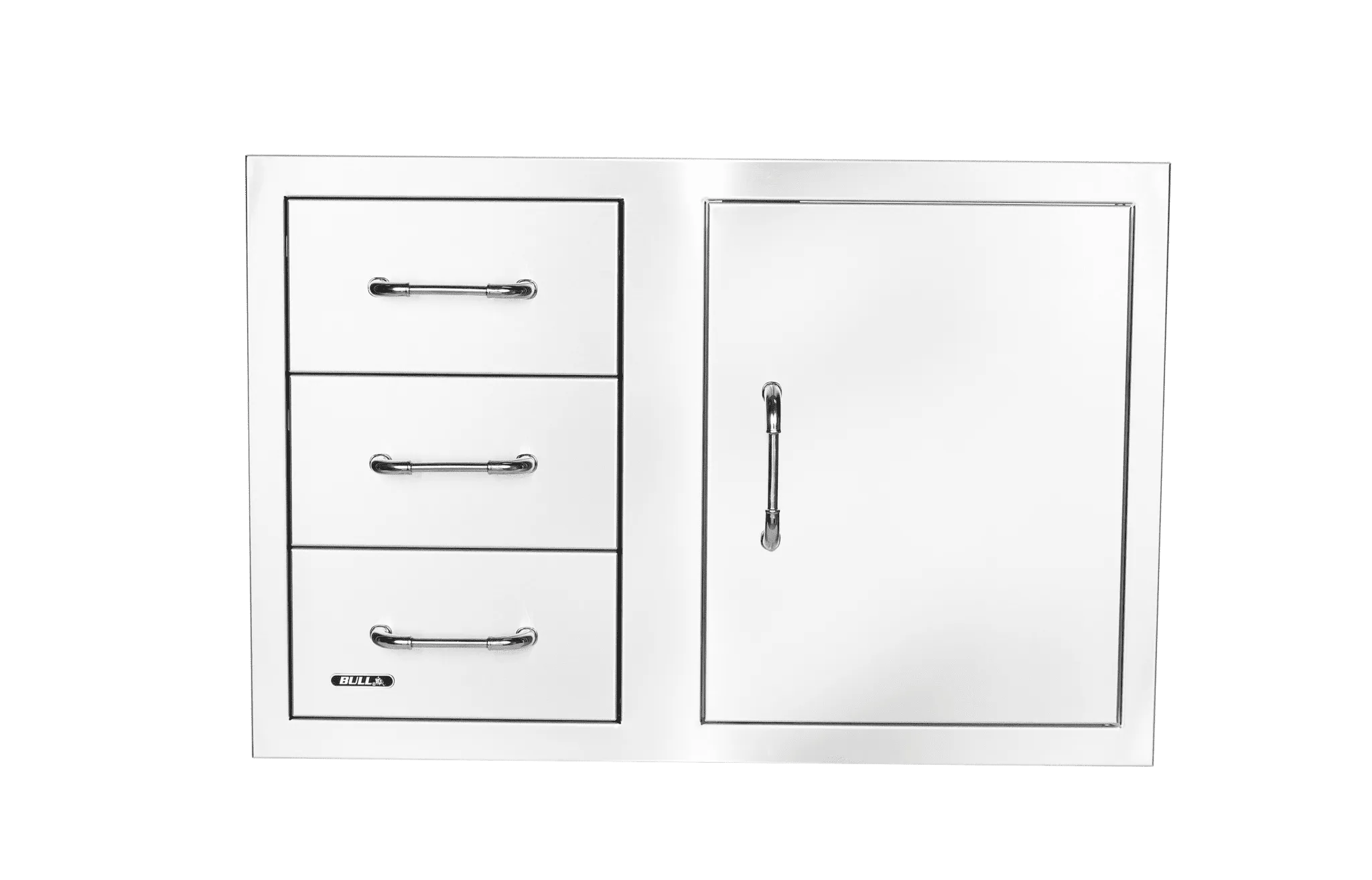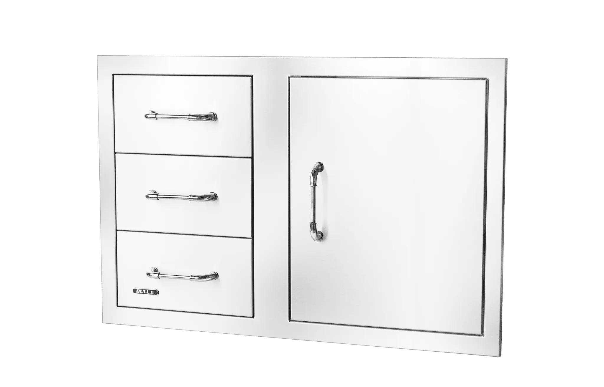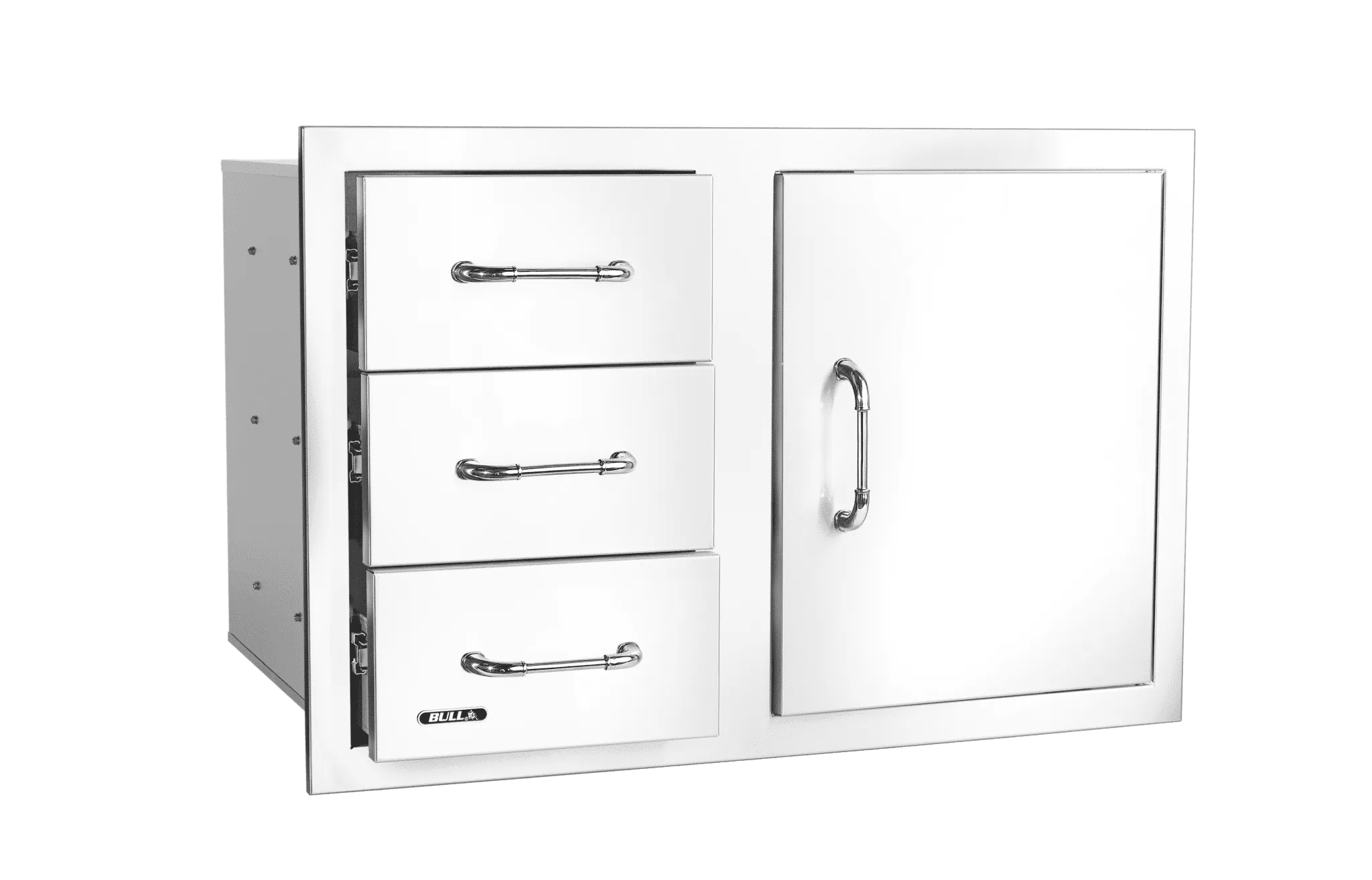 Revamp your outdoor kitchen with the sleek and functional Bull 30″ Stainless-Steel 3 Drawer Door Combo. This unit, expertly crafted from high-quality stainless steel, features three spacious drawers and ample storage for all your grilling essentials and outdoor cooking gear. Its sleek reveal design seamlessly integrates into your outdoor culinary space, adding sophistication and convenience. Perfect for storing utensils, spices, or other accessories, the Bull 30″ Stainless-Steel 3 Drawer Door Combo epitomizes functionality meeting aesthetics. Keep your outdoor cooking area both efficient and visually appealing. This essential and stylish outdoor kitchen accessory enhances your grilling setup and organizational flow.
