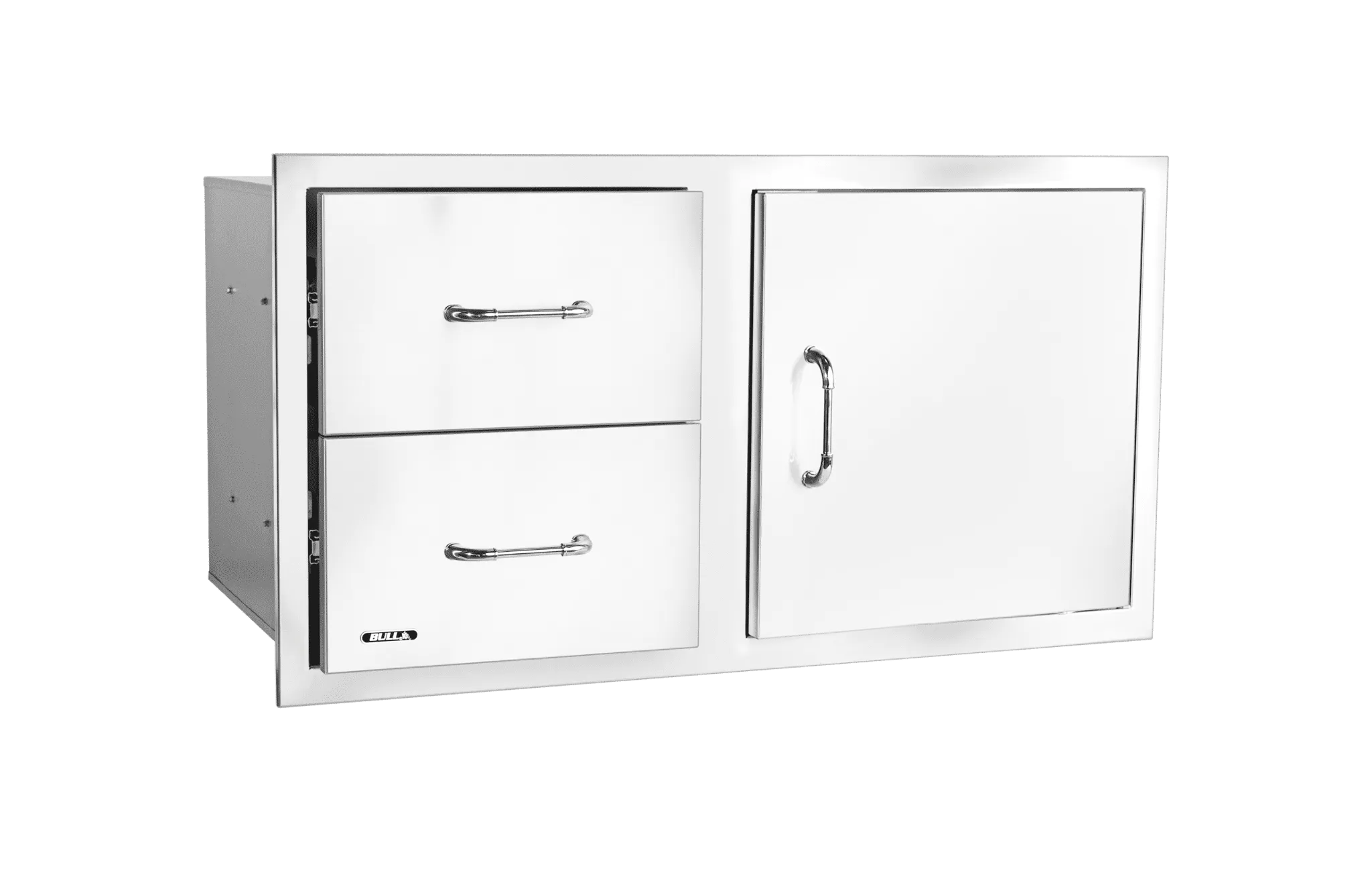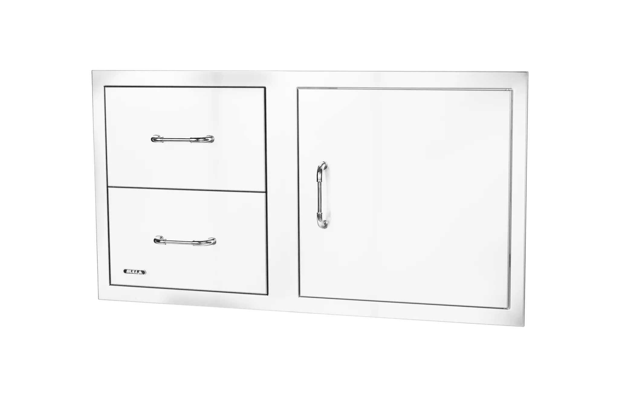 Enhance your outdoor kitchen with the Bull Stainless Steel Door/Propane Drawer Combo, showcasing a sleek Reveal Design. Expertly crafted from stainless steel, this unit provides storage versatility and a modern aesthetic. It offers ample space for your trash or propane tank and features a convenient access door connecting seamlessly to your grill. This combo unit combines style and practicality, making it a valuable addition to your outdoor cooking space.