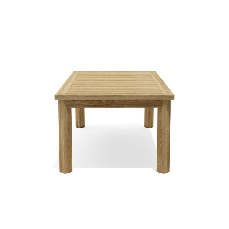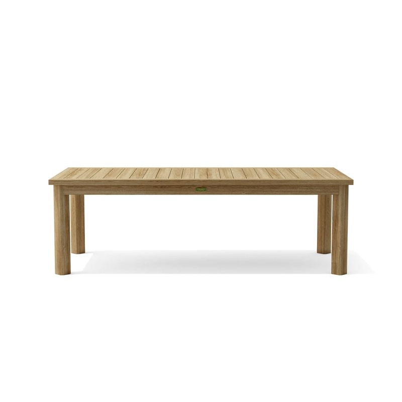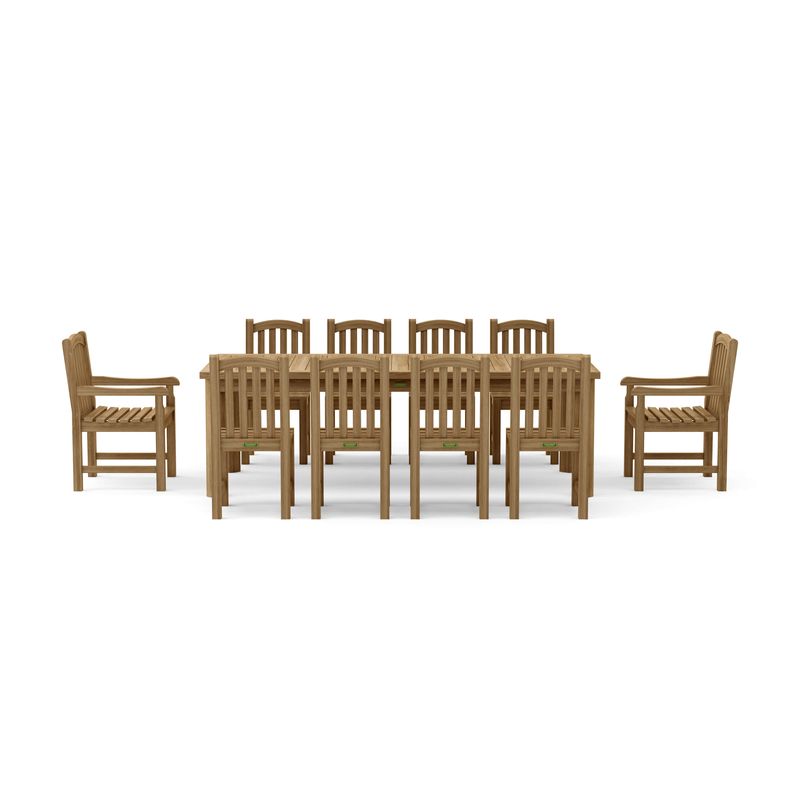 A luxurious dining set seating up to ten, host large outdoor dinners with family and friends in the comfort of your home and outdoors with this 11-Pc Chelsea Rectangular Dining Table Set. Made from genuine grade solid teak wood, this set features the Chelsea Dining Table, measuring up to 92 inches wide by 43 inches in depth. Also arrives with 8 Chelsea Dining Chairs and 2 Chelsea Dining Armchairs. Expertly crafted and shaped to an exquisite classic design, this teak dining features exceptional design and premium quality.