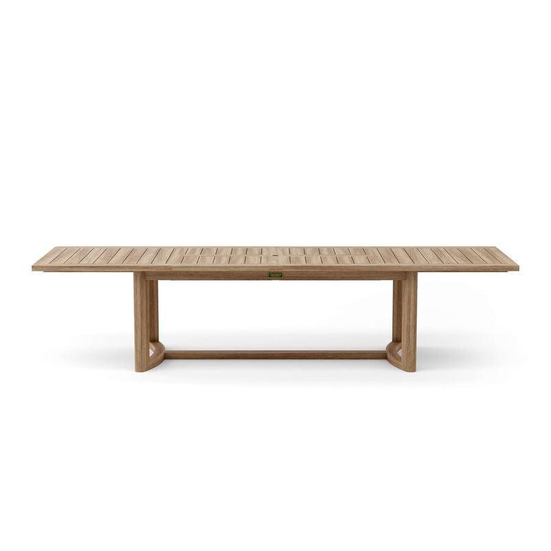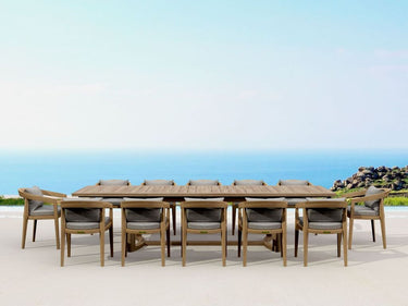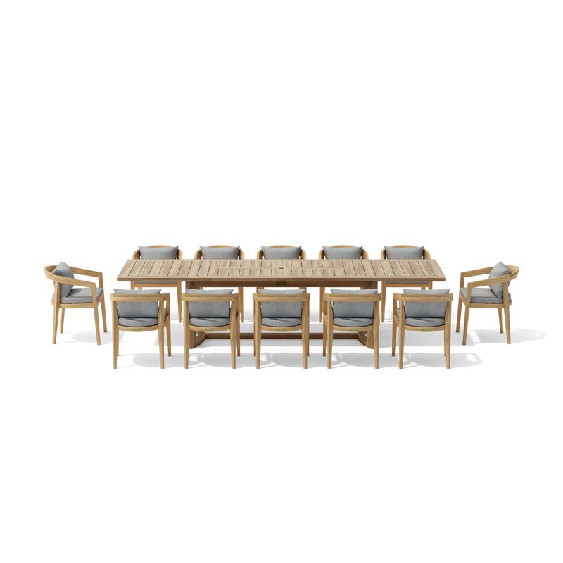 A luxurious dining set that seats up to twelve, host large outdoor dinners with family and friends in the comfort of your home with the Toscana Extension Table and Dining Armchair Set. Made of genuine grade solid teak wood, this set features the Toscana Extension Table, measuring up to 88 inches in length or 136 inches when fully extended. The built-in butterfly pop-up leaf enables you to open or close your table in less than 15 seconds, and the table can be extended with 1 or 2 leaves depending on the size needed. Also arrives with 12 Toscana Dining Armchairs which includes comfortable cushions and pillow from All-Weather Sunbrella fabrics, with your color choice. Expertly crafted and shaped to exquisite design, this round curved dining set features exceptional design and premium quality.