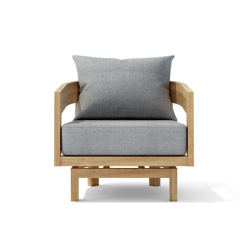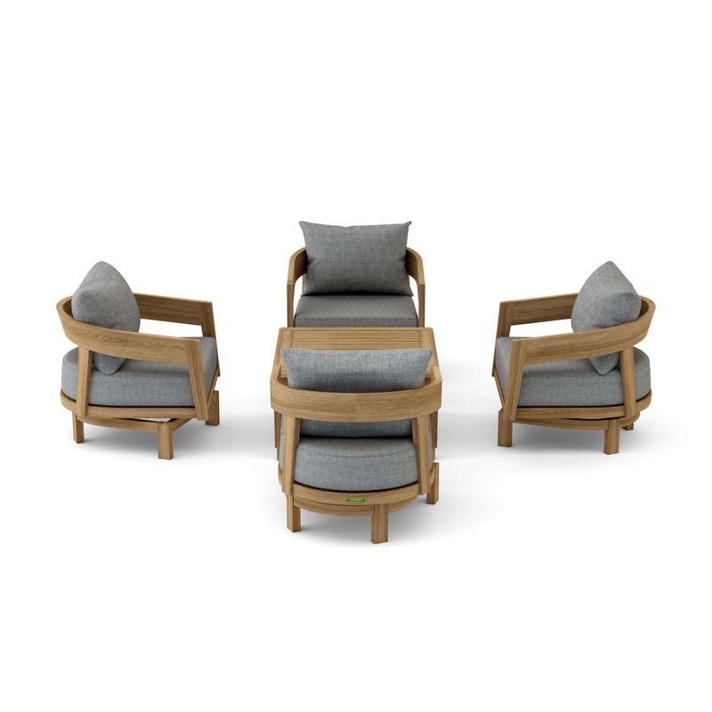 Shaped to an exquisite round curve design and expertly crafted from premium grade unfinished teak, take a seat in deep seating comfort with the Toscana Swivel Lounge Chair. Featuring a swivel mechanic that rotates up to 360 degrees, it doesn’t snap back but remains firmly in place at any position. Featuring 6” cushions from All-Weather Sunbrella Fabrics, it’s the perfect material for continued outdoor use through rain, hail, or shine. This set of four Toscana Swivel Armchairs also includes a 32" x 32" Square Coffee table.