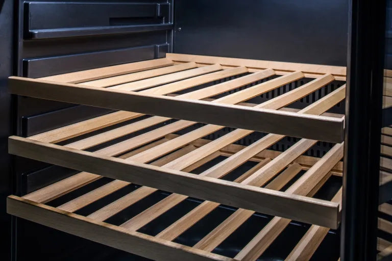 - Sleek beverage center easily transforms into a wine fridge with added beech shelving