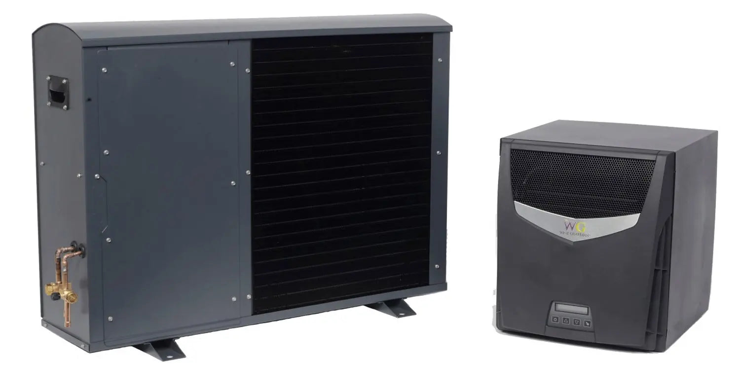 The Wine Guardian split system unit includes a fan coil unit (evaporator) and condensing system. The two units are connected with coolant lines that carry cooled refrigerant from the condenser to the fan coil and heated refrigerant back to the condenser to be cooled down again. The fan coil unit is designed to be used either as a free blowing, through the wall unit or as a remote mount unit.