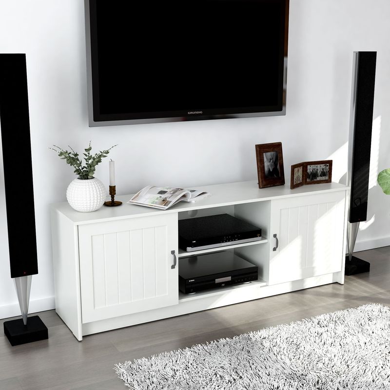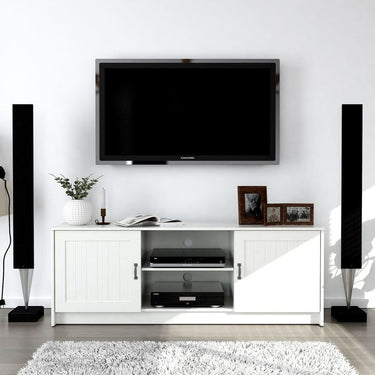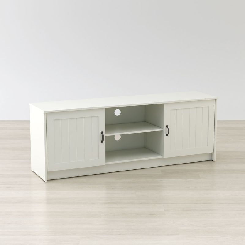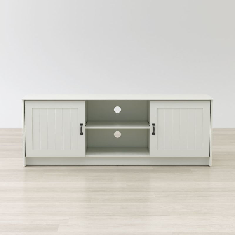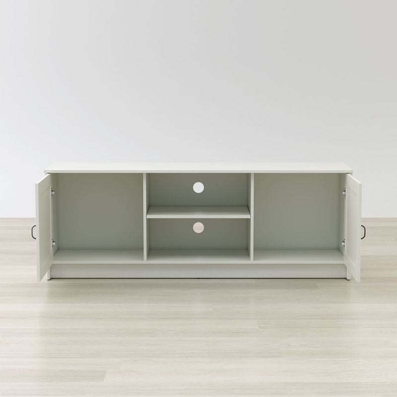 Elevate the look of your living room with this simple and traditional Ashley 63” TV Stand and Media Console Storage. Perfect for placing your TV receivers, speakers, game stations, portraits and more, seamlessly run any wires or cables through the two grommet holes from the removable center shelf and divider. Featuring ample storage space behind two metal door handles it’s the perfect TV Stand and Media Console Storage for your living room and home.