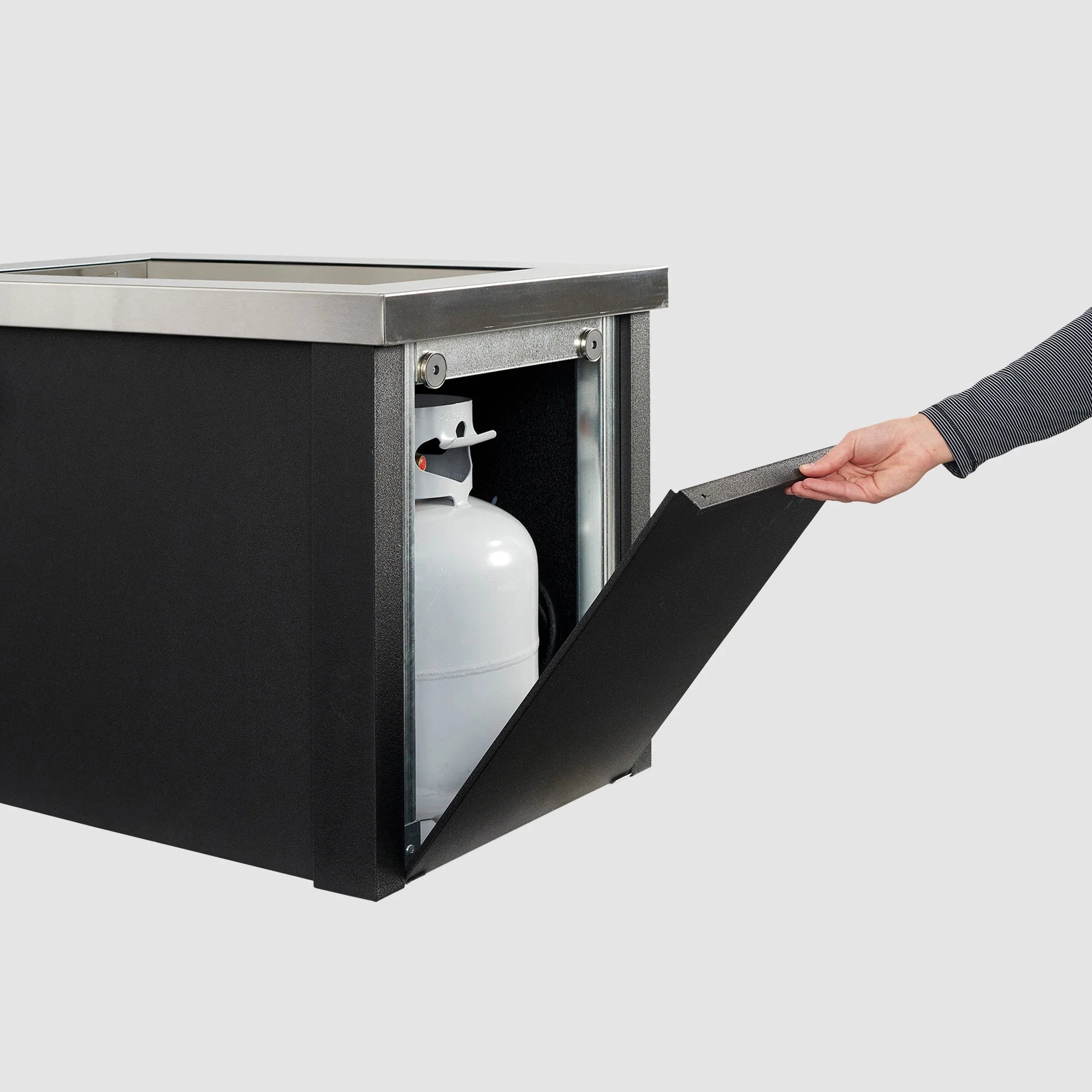 - Tank management Sliding Access Door conceals a standard 20 lb propane tank in the base for clean aesthetics and easy replacement.